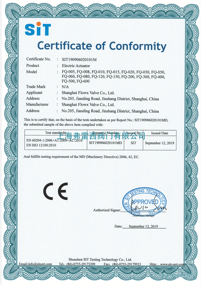 弗雷西電動執行器防爆ce證書