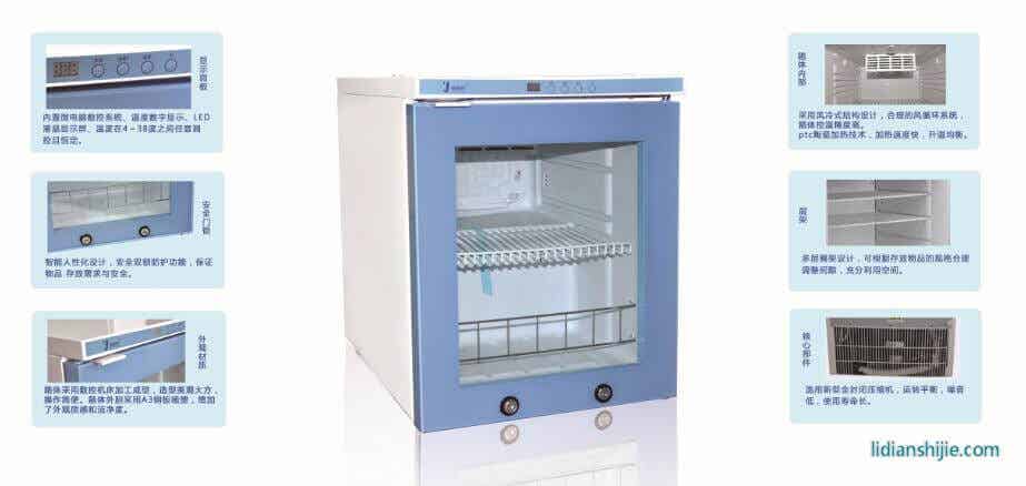 智能--智能控制風扇強制冷氣循環系統.確保箱體內部溫度均勻性,自動溫度控制:大屏幕液晶顯示.在2-48℃范圍內可自由調節溫度設定值.溫度控制精度0.5℃.門框雙鎖控制.自動報警功能.物品存放更.
