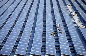 電池板設置作業(yè),先要在陸地上將電池板安裝在浮體式架臺上,將連接14張電池板的陣列(電池板設置單位),用船拖至水上的電池板設置場所(水上漂浮的太陽能電池板)后,再行連接。