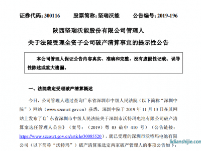11月7日,鋰電陜西堅瑞沃能股份有限公司(300116.SZ)發(fā)布公告稱,深圳市中級人民法院已裁定受理旗下子公司沃特瑪破產(chǎn)清算一案。