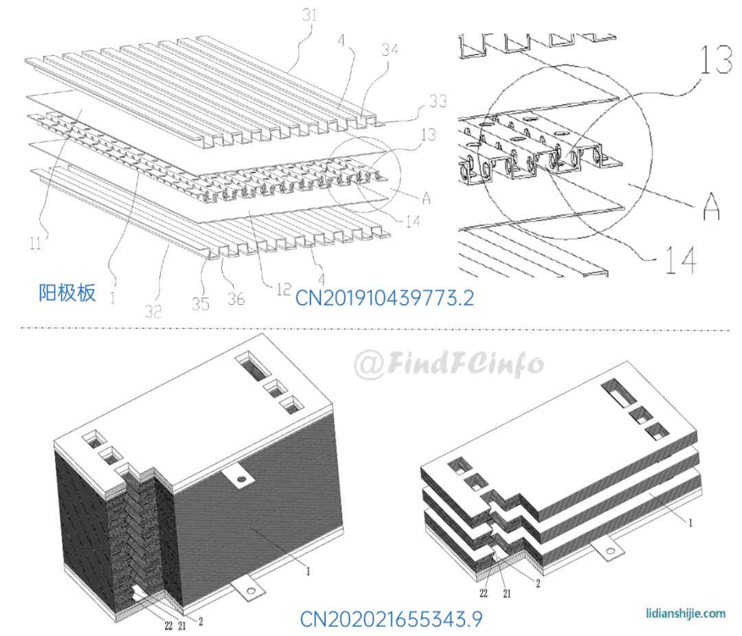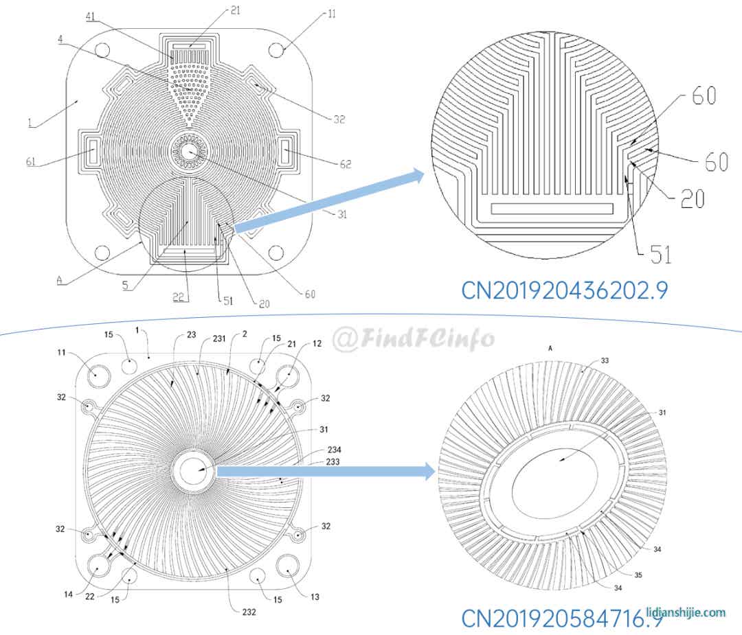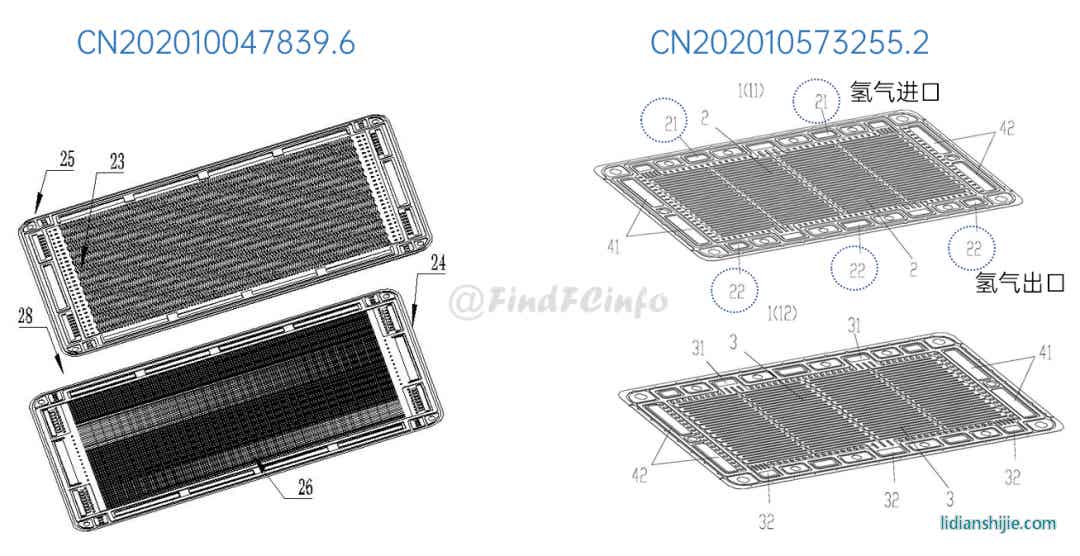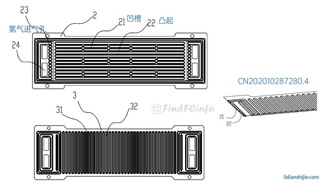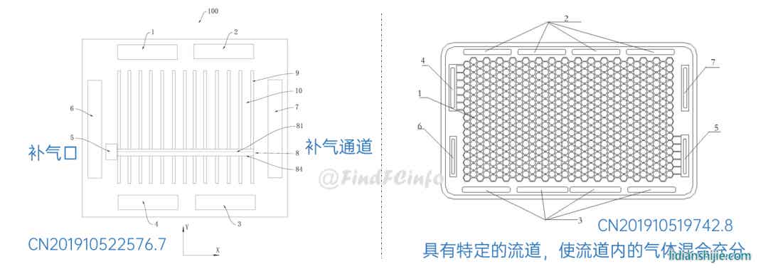 另外,格力還公開了兩種風(fēng)冷型電堆,如專利CN201910672211.2公開的電堆中,膜電極和單極板在電池單元疊置方向間隔交錯(cuò)設(shè)置,每一單極板的兩側(cè)分別形成陽極氣體槽道和陰極氣體槽道,相比于現(xiàn)有常規(guī)金屬雙極板燃料電池結(jié)構(gòu),該電堆厚度能大約降低一半,極板兩側(cè)分別為陽極氣體和陰極氣氣體的流動(dòng)空間。專利CN202020377026.9中電堆增加了進(jìn)風(fēng)區(qū)域面積,形成了更加均勻的進(jìn)風(fēng)結(jié)構(gòu),有利于提高陰極反應(yīng)氣體傳質(zhì)、提高陰極反應(yīng)氣體流量、降低其流動(dòng)阻力等。