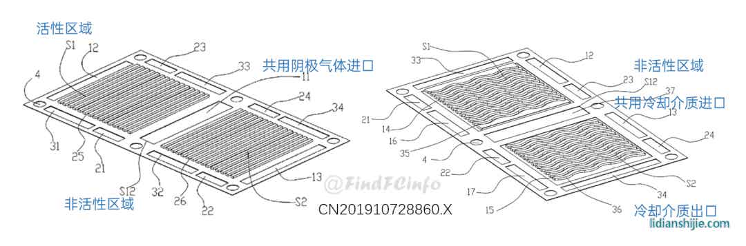 在提高電堆功率密度方面,專利CN201910728860.X公開了在極板上形成兩個(gè)活性區(qū)域,且兩個(gè)活性區(qū)域共用一個(gè)非活性區(qū)域,從而提高了活性區(qū)域的占比以及非活性區(qū)域的利用率,使燃料電池結(jié)構(gòu)更加緊湊,提高了電池功率密度。