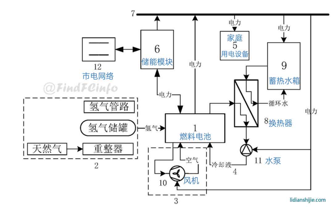 專利CN202020515628.6公開了一種家用熱電聯(lián)供系統(tǒng),其中蓄熱模塊能夠回收燃料電池的廢熱,并將熱能提供給家庭使用;儲(chǔ)能模塊能夠接收并存儲(chǔ)燃料電池的電能;直流供電模塊能夠?qū)⑷剂想姵睾蛢?chǔ)能模塊提供的電能輸送給家庭用電設(shè)備。