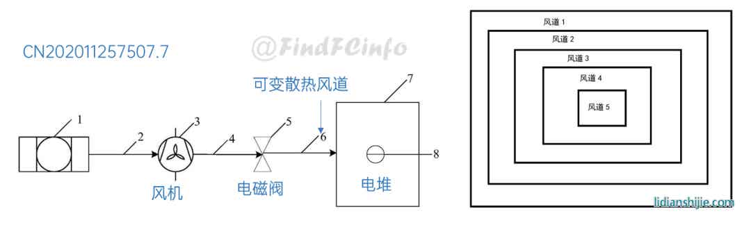 在燃料電池?zé)峁芾矸矫妫窳_的專利既涉及風(fēng)冷型電堆,也涉及到水冷型電堆。在風(fēng)冷型電堆熱管理上,專利CN202011257507.7通過在電堆和風(fēng)機(jī)之間設(shè)置可變散熱風(fēng)道,利用控制器調(diào)整可變散熱風(fēng)道上多個(gè)散熱子風(fēng)道的開啟數(shù)量或關(guān)閉數(shù)量,來實(shí)現(xiàn)對(duì)電堆的精準(zhǔn)控溫。