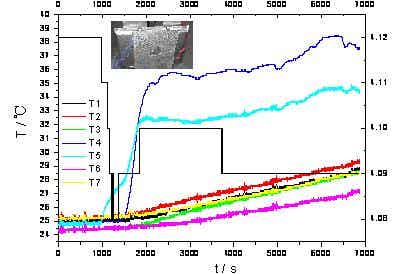 圖11為電池熱箱試驗(150℃/30min)的連接及溫度采集點位置布局圖。圖12為電池熱箱過程中電池電壓、溫度的變化測試曲線圖。