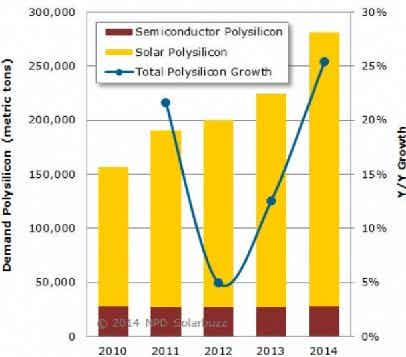 根據NPD Solarbuzz,由于預計2014年全球終端市場需求達49GW,多晶硅需求正在大幅提高。