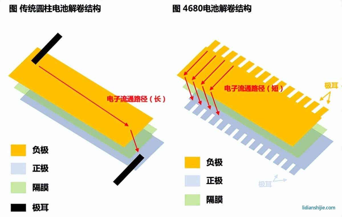 除了尺寸之外,4680電池還有一些技術創新。比如它采用了無極耳或全極耳的設計,就是把正負極薄膜上的邊緣都做成鋸齒狀,然后折成一個平面作為輸出端。這樣可以大幅減少動力電池的發熱和內阻,提高效率和安全性。