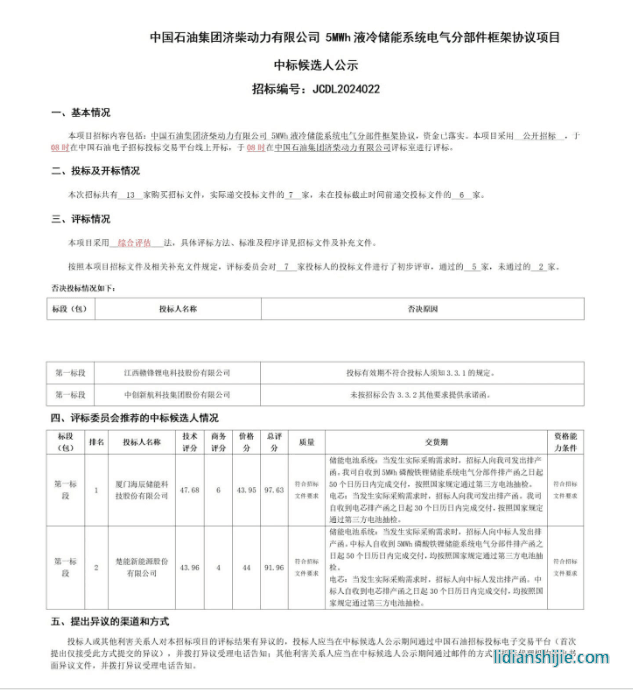 北極星儲能網(wǎng)獲悉,5月29日,中國石油濟(jì)柴動力5MWh液冷儲能系統(tǒng)部件框采中標(biāo)候選人公示,據(jù)悉,海辰儲能、楚能新能源、鵬輝能源、瑞浦蘭鈞、天合儲能、中創(chuàng)新航和贛鋒鋰電共7家企業(yè)參與投標(biāo)。其中中創(chuàng)新航和贛鋒鋰電被否決,最終海辰儲能、楚能新能源分別為第一、第二中標(biāo)候選人。