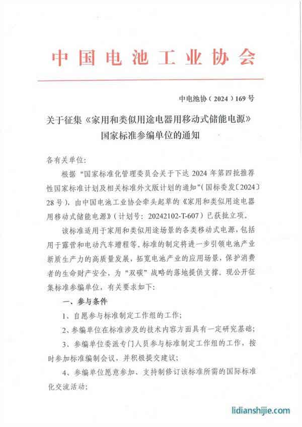 關(guān)于征集《家用和類似用途電器用移動式儲能電源》國家標準參編單位的通知 2024-07-30 電池中國網(wǎng)3060 核心提示:家用和類似用途電器用移動式儲能電源國家標準參編單位的通知 家用和類似用途電器用移動式儲能電源國家標準參編單位的通知 點贊 0舉報收藏 0打賞 0評論 0分享 67 更多>同類鋰電資訊 • 21世紀經(jīng)濟報道年終特刊專訪丨王燕清:我們不是 • 定義大儲能時代智造標準丨先導智能聯(lián)合外媒重磅 • 第一財經(jīng)專訪丨先導智能:以技術(shù)攻堅鑄就全球鋰 • 持續(xù)推動暖光公益活動落地,宮晨瑜女士榮登ESG • 喜報!先導集團董事長王燕清榮膺2025“上證鷹· • 深耕智造創(chuàng)新,彰顯標桿底蘊丨先導智能子公司獲 • 新能源智能裝備領(lǐng)域唯一上榜丨先導智能強勢入選 • CREC 2025丨先導智能與您共赴行業(yè)盛會,同創(chuàng)智 • -30℃穩(wěn)定運行!哈啰沈陽共享電單車全系搭載億 • 億緯鋰能與徐工動力簽署戰(zhàn)略合作協(xié)議