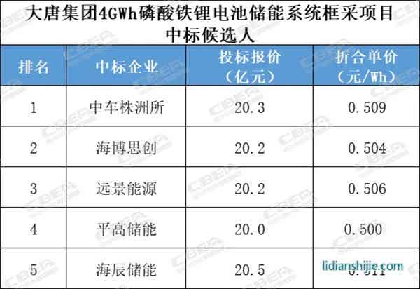 最終,中車株洲所、海博思創、遠景能源、平高儲能、海辰儲能5家企業入圍中標候選人,入圍單價在0.500元-0.511元/Wh。其中,最高報價企業海辰儲能為0.511元/Wh,最低報價企業平高儲能為0.500元/Wh。