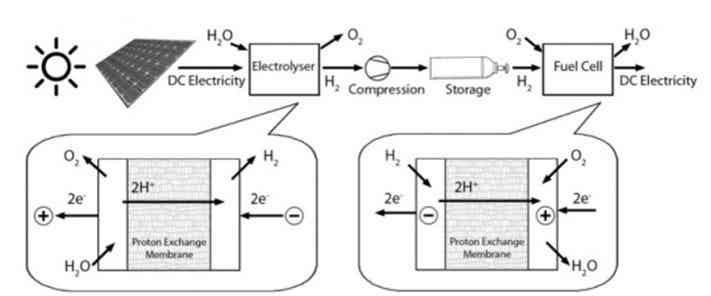 傳統系統需要電解水并分離出氫氣和氧氣,然后將之分別存儲于燃料電池的兩端。在需要產生電能的時候,氫氣和氧氣會被送到用于化學反應的電解槽。