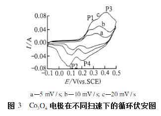 圖3是Co3O4電極在不同掃描速度下的循環(huán)伏安圖。由圖3可見,該電極材料在0.3V和0.4V附近有一對明顯的氧化峰,在0.1V和0.2V附近有一對明顯的還原峰,其中,P1峰是Co2+氧化成Co3+的過程,P2峰是其逆過程;P3峰是Co3+氧化成Co4+的過程,P4峰是其逆過程。氧化還原電流較大,可判斷在200℃下熱處理得到的Co3O4電極材料在工作范圍內(nèi)顯示了較好的電容特性。另外,根據(jù)電勢對電流的響應(yīng)主要依賴于電勢的變化而不依賴于電流,即循環(huán)伏安曲線的電流隨著掃描速率的增加而增加,這種對應(yīng)關(guān)系也可以說明該材料有快速充放電特性。
