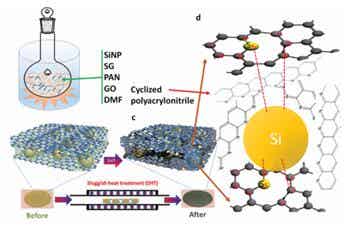 由硅納米顆粒、硫摻雜的石墨烯以及聚丙烯腈混合材料涂覆后的負極極片經高溫處理后,硅會與周圍硫化石墨烯中的硫以共價鍵的相互作用被相對固定到一個位置,而聚丙烯腈將會進行環化反應形成一個含氮的穩定六圓環結構的石墨化碳。如此,通過熱處理,一個穩定的原子尺度的結構構筑成型;其中,一方面,硅通過共價作用被以石墨烯納米片層所組成的支架所保護,另一方面,石墨化的聚丙烯腈形成的網絡結構,進一步加強了對硅穩定的防護。