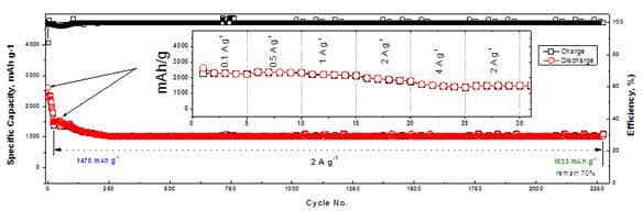 正是由于這種電極微觀結構的構筑成型,使得電極在充放電過程中硅的體積膨脹能夠被固定到一定的空間范圍之內,電極結構不會被破壞,確保了電極能夠到達2000次的循環壽命;另外,此結構體高的電子和鋰離子傳導性也保證了硅材料容量的正常發揮,即在0.1A g-1電流循環100次,整體電極的平均容量達到2750mAh/g-1;在更高倍率2 A g-1循環2275次,容量依然能夠保持在1000mAh/g-1以上。