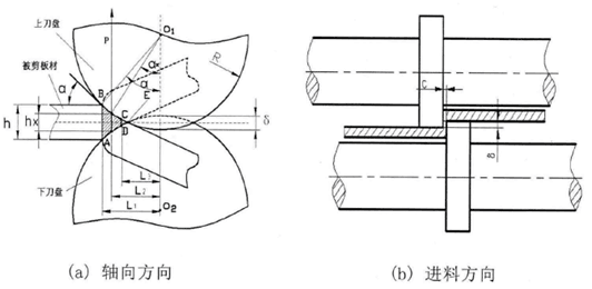 (1)極片分切時,上下圓盤刀具有后角,類似與剪刀刀刃,刃口寬度特別小。上下圓盤刀不存在水平間隙(圖1中所示參數(shù)c相當(dāng)于負(fù)值),而是上下刀相互接觸并存在側(cè)向壓力。