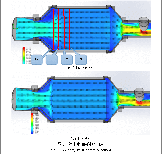 圖3是兩個項目催化體軸截面速度場帶矢量的云圖,圖4是對兩個項目制作多個徑向截面速度切片,所取切片位置示于圖3(a)中,與S0分別相距10mm(S1)、20mm(S2)、30mm(S3),以便觀察氣體在催化體內部的流動特性。