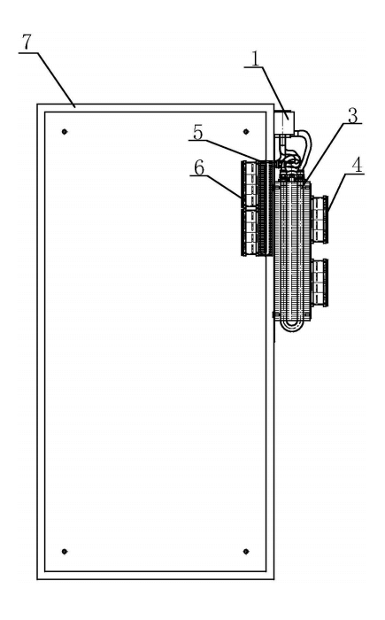 圖中:1-水箱,2-循環水泵,3-外部水冷卻熱交換排組,4-外散熱風機,5-內部水冷卻熱交換排組,6-內吸熱風機,7-電柜。