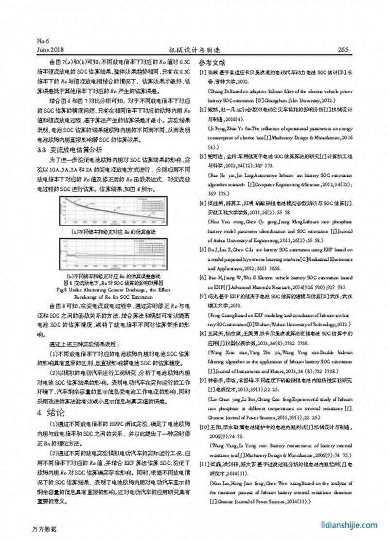 核心提示:電動汽車作為新型節能環保的交通工具之一,以常用磷酸鐵鋰電池為研究對象,分析電池歐姆內阻是否對荷電狀態(State of Charge,SOC)的估算存在影響.通過不同放電倍率的混合脈沖功率特性(Hybrid PulsePower Characteristic, HPPC)實驗對電池歐姆內阻進行了分析和辨識,并提出了一種實時修正歐姆內阻的原理和方法,以建立等效電路模型和濾波算法方法實現了在不同放電倍率下的SOC估算,報告了不同放電倍率下歐姆內阻對估算SOC及汽車容量信息顯示存在影響的現狀.研究結果表明,電池