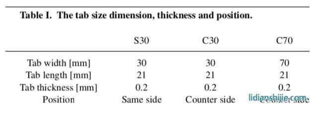 為了驗證模型的有效性,作者采用了三種結構的軟包電池對實驗結果進行驗證,三種電池的正極材料均為NCM622材料,負極均為石墨材料,電池容量為16Ah,尺寸為117mm×101mm×11.5mm,其正極、負極和隔膜的結構和尺寸完全一致,僅極耳結構和位置不同(如下圖所示),三種電池的極耳結構詳細信息如下表所示。