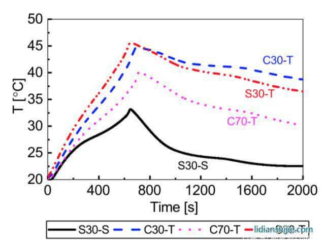 從下圖中能夠看到采用表面散熱的S30電池在整個過程中電池表面的溫度最低,在放電結束時的最高溫度為33.3℃,采用極耳散熱的S30和C30電池溫度最高,在放電結束時電池溫度分別達到了45.5℃和44.5℃,而采用寬極耳設計的C70電池溫度出現了明顯的降低,放電結束時的最高溫度比窄極耳設計的S30和C30電池低了6℃,表明寬極耳設計能夠有效的提升散熱效果。