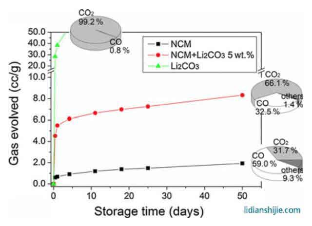 由于NCA和NCM材料表面的LiOH、Li2CO3雜質含量要明顯高于LCO材料,因此作者認為NCA和NCM材料高溫存儲的初期階段產氣比較快主要是受到兩種材料表面雜質的影響。為了驗證這一觀點,作者在NCM材料中摻入了5%的Li2CO3粉末,并進行了高溫存儲。從下圖中產氣曲線可以看到在電解液中加入了純Li2CO3粉末后在存儲的初期快速產氣,產生的氣體成分主要是CO2,而在NCM材料中添加Li2CO3粉末后產氣同樣大大增加,產生的氣體為66%的CO2和32%的CO,純的NCM材料在電解液中產氣較少,32%為CO2,59%為CO,這表明Ni基材料表面的LiOH、Li2CO3雜質是引起高溫存儲初期產氣的主要原因,同時NCM材料自身會與電解液發生副反應,產生CO氣體,但是我們仍然對NCM材料與電解液反應只產生CO,還是同時產生CO和CO2不清楚。